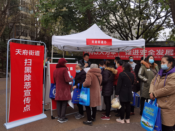 四川新闻网成都12月23日讯 为进一步提升人民群众安全感、满意度,有效遏制黑恶势力违法犯罪。2021年12月22日上午,成都市温江区天府街道结合安全生产法现场活动,在新市民广场开展扫黑除恶宣传教育活动。