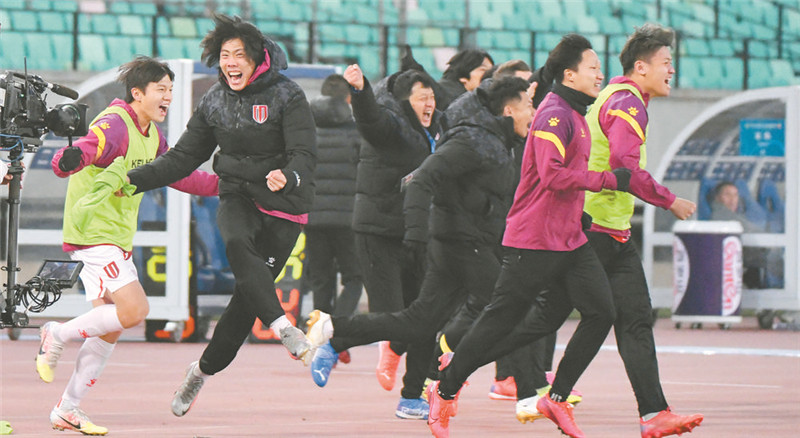 1月12日,成都蓉城队替补席球员庆祝球队升入中超。新华社发