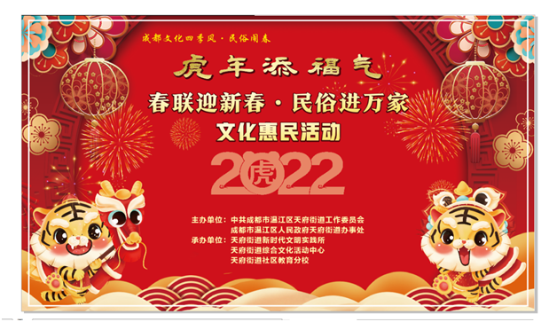 四川新闻网成都1月25日讯 新春将至,年味渐浓,为展示温江区天府街道办事处良好的精神风貌,1月25日,温江区天府街道办事处在天府三圣广场开展了“虎年添福气!2022年“春联迎新春·民俗进万家”文化惠民活动。
