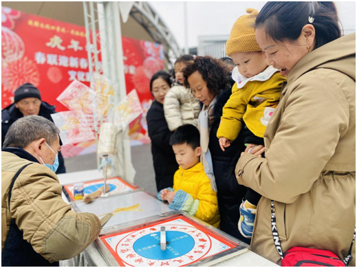 “挂灯笼 迎新春”摊位:居民们在工作人员的引导下,亲手制作灯笼,正所谓大红灯笼高高挂,张灯结彩迎新春。