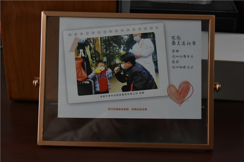 四川新闻网成都2月16日讯 日前,记者前往区民政局采访吴蒙时,他正在办公室为人口管理服务工作忙碌着。在摆满文件的办公桌上,一张“致敬最美逆行者”的照片格外引人注目。2020年新冠肺炎疫情暴发之后,吴蒙第一时间向组织递交了“请战书”来到了双流区的隔离点工作。桌上这张照片,正是当时他给一个刚到隔离点的小朋友加油打气时,被现场工作人员抓拍的。