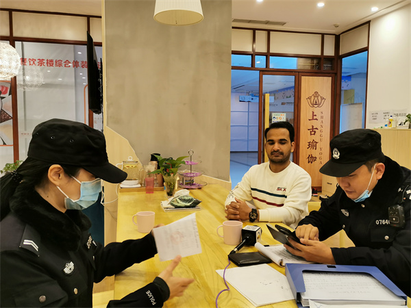 在东升街道乐福城市广场,张博和同事熟门熟路地上楼。走进一家瑜伽馆,他们便向来自印度、在此担任瑜伽老师的韦恩攀谈起来,并查询了他的护照等信息。