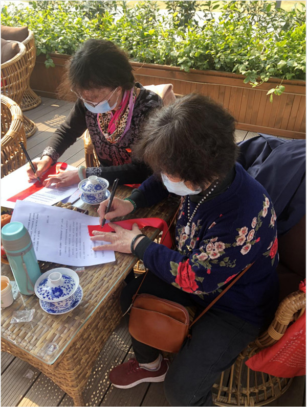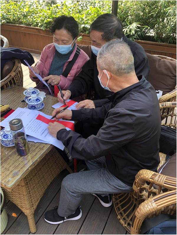 参与活动的22位党员在做好戴口罩、消毒等防疫防控措施后,在主持人宣读了党风廉政--“好家风好家训”活动的各个流程后。活动特别邀请到的成都市朗诵艺术家协会王厚蓉老师在先给大家诵读了“好家风好家训”中的“孝”经典片段;又逐字逐句讲解了每1句话的出处和其中涵义;还带领大家集体诵读了这些片段;本环节的高潮部分是王老师现场将参会人员分作2个队伍,大家进行“pk”形式阅读,引得大家的声浪比比皆高……在余音未消时,现场志愿者们又给全体参会党员每人发放了笔和红色绸缎,现场抄写了自己喜欢的部分片段。