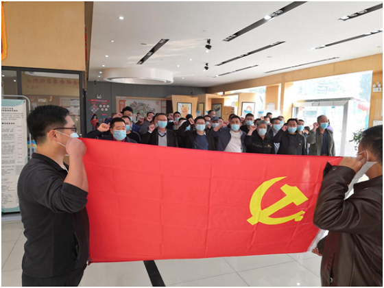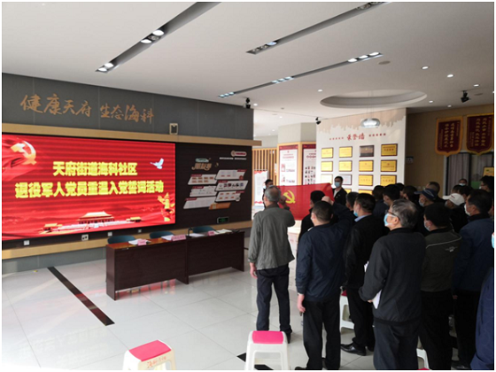 “我志愿加入中国共产党,拥护党的纲领,遵守党的章程……”在温江区天府街道海科社区党委书记、退役军人服务站长舒兵领誓下,退役军人党员面向党旗,高举右拳,用坚毅的目光,洪亮的声音,重温入党誓词,再次接受一次心灵的净化和洗礼。