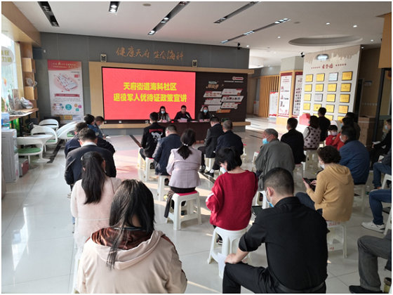 宣誓活动结束后,随即开展了退役军人优待证政策宣讲。温江区天府街道海科社区相关负责人组织学习了《四川省优待证管理办法实施细则》,详细讲解了四川省优待证申领的适用范围、申领程序、所享有的优先和优惠待遇以及注意事项,让退役军人和“三属”们及时、深入了解相关政策。通过耐心细致的交谈,社区进一步了解退役军人群体的所思、所想、所忧、所盼,认真听取他们的意见和建议。