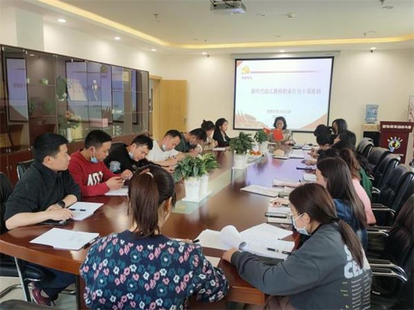 会议第一项流程,邓红带领全体党员学习《新时代幼儿园教师职业行为十项准则》及《成都市新都区教师职业行为十项禁令》。她以事例警示、问题点拨等形式,对文件内容进行了详细的解读,要求全体教师特别是党员同志一定要守住自己的职业道德底线,注意一言一行,决不能触犯师德高压线,严禁体罚和变相体罚幼儿。要从本身教育教学实际出发,认真反思总结,树立规范意识,不断提高自己的专业技能和师德修养。