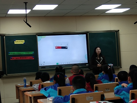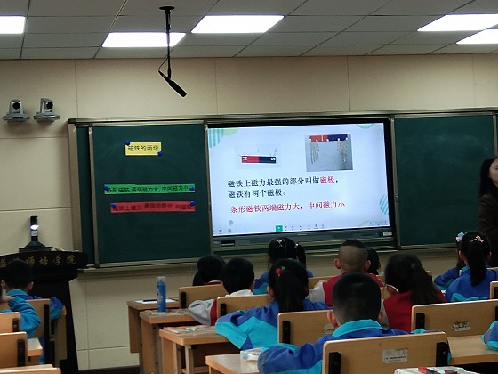 本次活动由福洪小学的罗珊老师为大家带来了一节二年级的科学课《磁铁的两极》。课上,学生首先在罗老师的指导下利用回形针初步感受了磁铁各部分磁力的大小,然后让学生设计试验方法,讨论研究条形磁铁的磁力分布。接着让同学们动手实验,感受条形磁铁的磁力分布,通过发现磁铁中间部分是否有磁力的新问题引入第三个实验环节——铁粉与磁铁接触。本节课,罗老师通过环环相扣的环节,让学生感受到研究科学问题的快乐与成就感,也让在座的老师们体验到了科学课的精彩与奥妙。