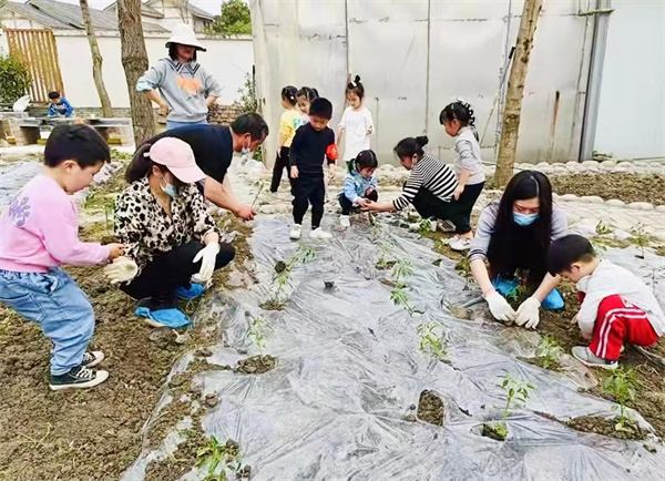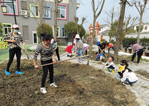 种植的过程中,家长挖地松土,孩子们除草、敲土分工有序。在大家的共同努力下,一粒粒种子、一株株秧苗安然地躺在温暖的泥土里,散发着勃勃生机。