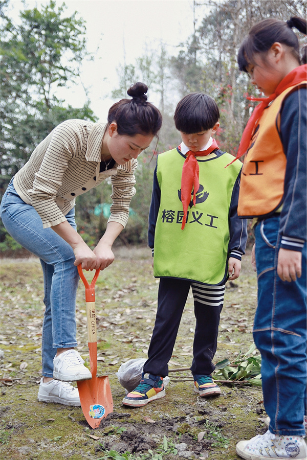 接着榕园娃还动手参与劳动实践……挖土、培土、踩实、浇水,大家保持合适的距离,自行组队,分工合作,配合默契,每一道工序都一丝不苟,活动现场气氛热烈、有条不紊,每个人都热情高涨,整个植树现场呈现一片热火朝天的劳动景象,洋溢着团结协作、昂扬向上的融洽氛围。