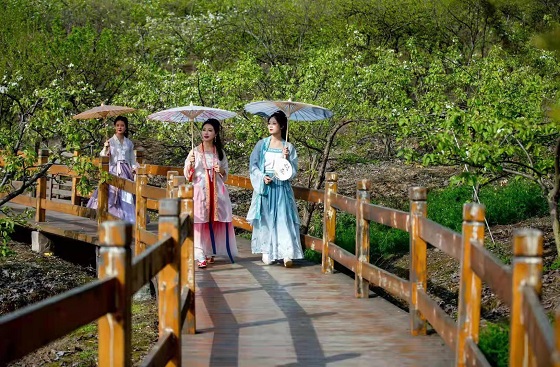 本次云推介活动主会场设在彭州市葛仙山镇缤纷梨园。葛仙山镇地处湔江河谷生态旅游区的核心地带,是彭州市山地生态旅游靓丽新名片,也是彭州市花卉观赏资源最为富集的区域,每年3-4月,超4000亩梨花竞相开放。雪白的梨花一簇簇,在春风中轻轻摇曳,花朵漫山遍野就像雪白的浪花。活动现场还设置了国风品茶区,通过视觉与味觉的双重享受,营造浓厚的赏花踏青氛围。