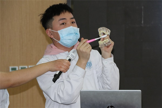 活动由学校副校长唐晓燕主持。活动中,王医生采用了介绍、问答、互动、发放宣传单等形式,给同学们普及了牙齿健康的重要性、牙齿的结构、儿童牙齿常见疾病、预防龋齿等方面的知识,现场示范了如何正确刷牙,并进行了刷牙指导。