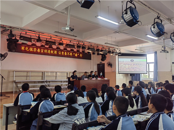 四川新闻网成都3月20日讯 为普及禁毒知识,遏制毒品蔓延,加强校园禁毒宣传⼒度,提⾼青少年的⼼理预防能⼒和禁毒意识,军屯中学邀请新都禁毒办⾛进学校,为⼀百多名学⽣开展⼀次主题为“无毒期许 樱薇笑语”的禁毒宣传教育活动。