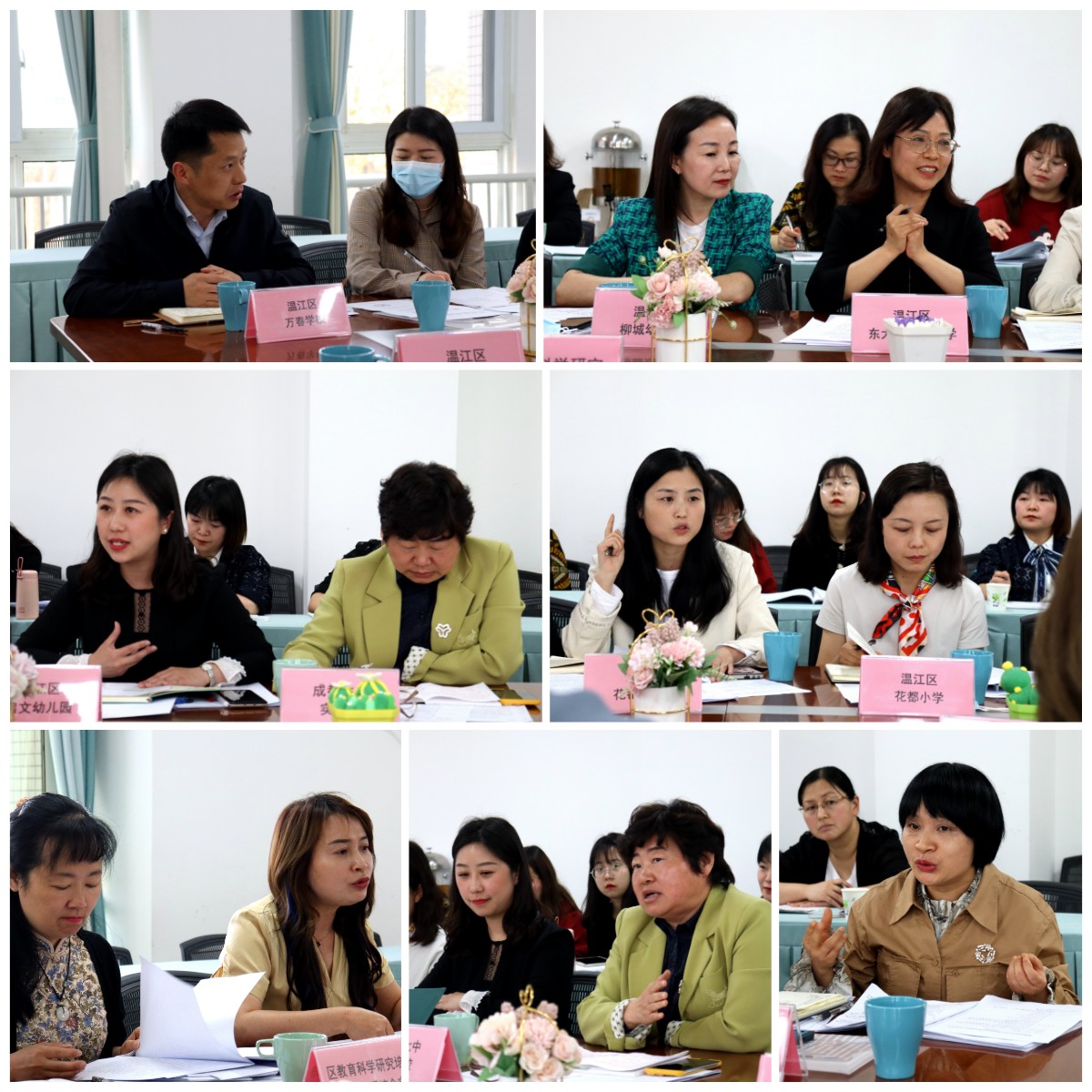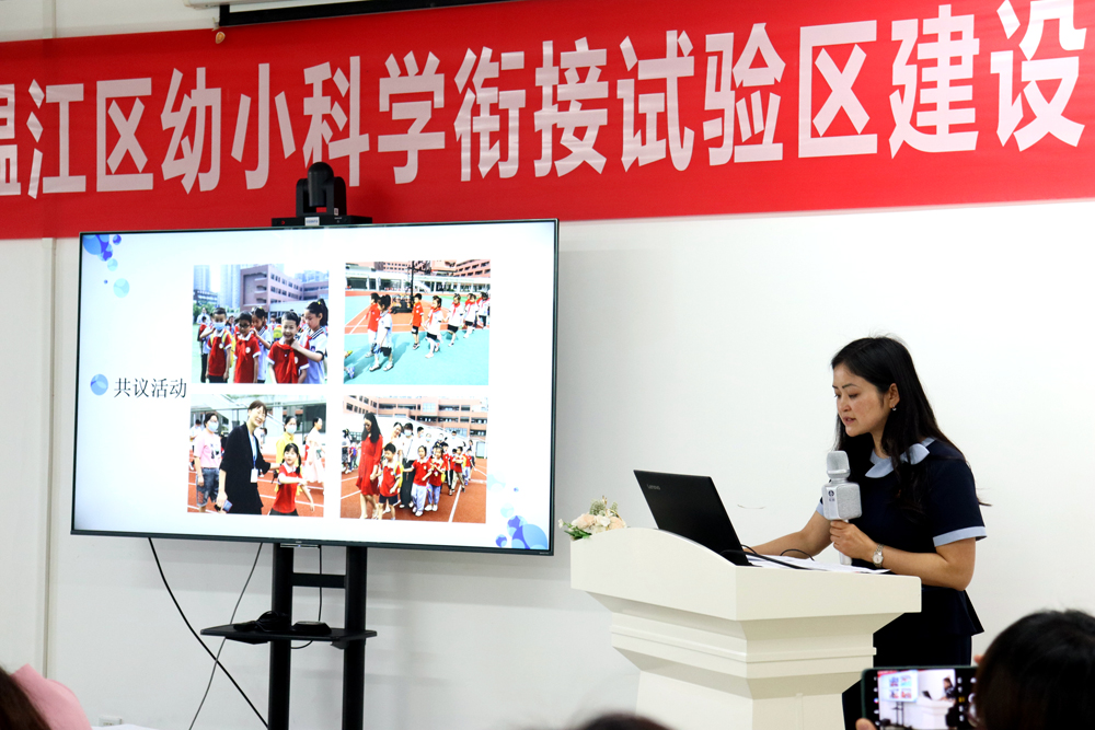 温江区幼小科学衔接试点园(校)校园长们就本园(校)开展的入学准备教育和入学适应教育方面的具体实施情况进行交流,小学低段教师结合班级幼小衔接现状进行分享。