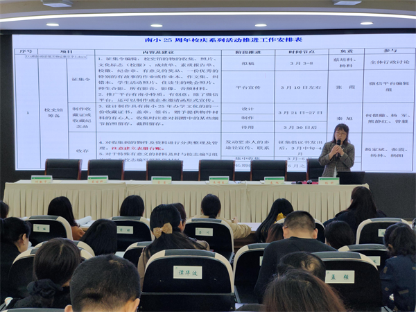副校长蔡培科在启动仪式上宣讲了学校25周年校庆系列活动规划与部署。蔡培科提到此次校庆系列活动包括第四届健育文化节、学校云端校史馆筹建、“我和南小的故事”主题活动、校志续编、学校宣传视频拍摄等活动。蔡培科就各项工作时间节点、人员安排、注意事项等做了安排与强调。