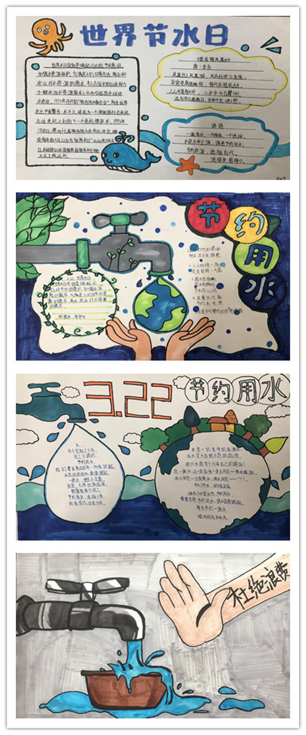 “小手拉大手”,孩子和家长一起制作手抄报。一张张用彩色蜡笔画出的青山绿水、蓝天大海、美好家园;一份份饱含真挚情感的文字,无不呼吁大家行动起来,珍惜水资源,保护水资源。