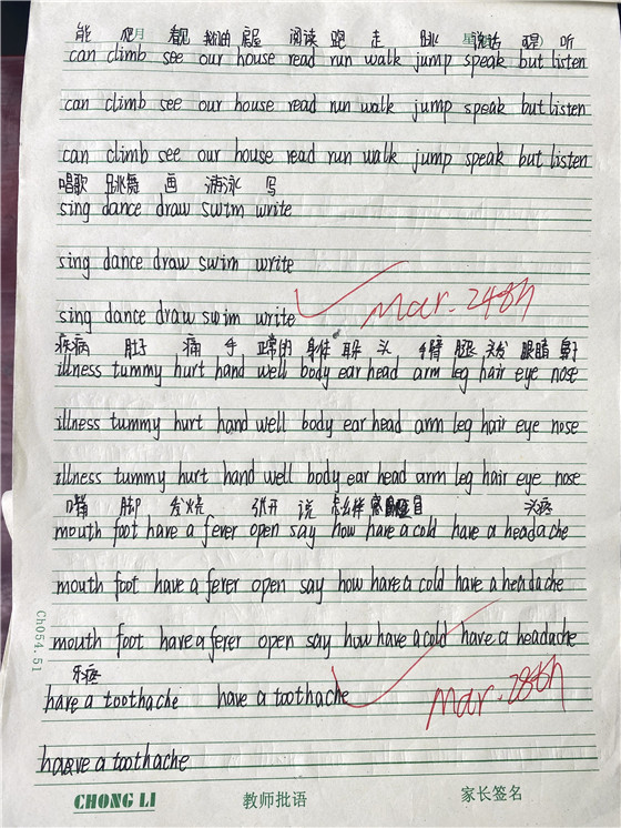 检查中发现老师们作业设计有针对性、体现分层,作业量适中。教师能以学生的全面发展为着眼点,突出重点、难易结合,作业布置少而精,没有布置机械重复的作业,有利于提高学生的创新意识。在作业批改方面,老师们批阅认真及时,全批全改,有等级、有日期。一部分老师在批改作业的同时,给学生们的作业盖上了趣味印章。例如:作业写得工整认真的学生会得到“今天的作业我很满意”“作业不错,比心”“作业完成较好,还需继续努力”等有意思的印章评语。有趣的印章极大地调动了学生们写作业的积极性。