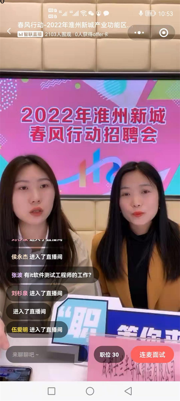 此次招聘会由淮州新城综合产业部和金堂县人力资源和社会保障局主办、智联招聘承办。据悉,通威太阳能(金堂)有限公司、成都士兰半导体制造有限公司、西南航空职业学院、成都环能德美环保装备制造有限公司4家重点企业参加了此次招聘会,提供岗位500余个,主要有工艺主管、计量助理工程师、气体工程师、工艺设计、教师、人事专员、焊工等36个工种。在直播现场,企业代表依次走进直播间,就企业的概况、招聘岗位、岗位要求和薪资福利等做了细致介绍。吸引求职者5297人次,获赞5000余次,互动留言近600条,在线收到简历543份。