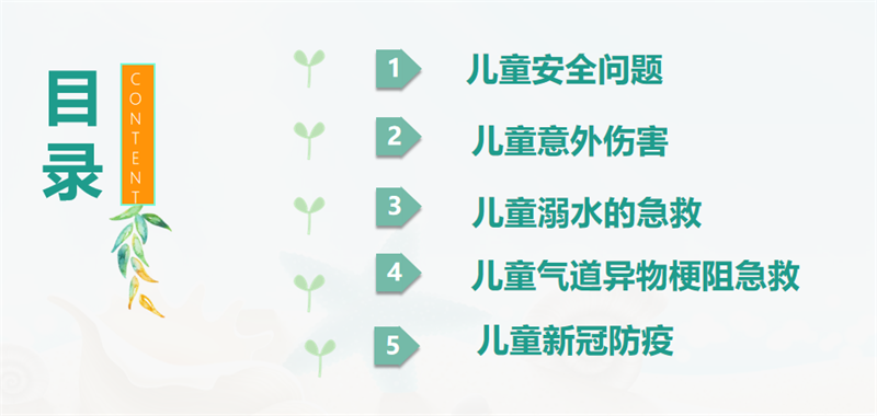 课程主要通过儿童安全问题、儿童意外伤害、儿童溺水的急救、儿童气道异物梗阻急救、儿童新冠防疫等方面进行了安全常识的宣讲。向孩子普及日常生活中常见的儿童安全问题,传授孩子急救技能,提醒孩子能自我关注和重视安全问题,学习一些必备的急救技能。
