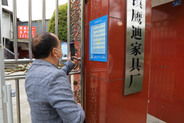 在新繁鹰迪家具厂正在进行安全检查的新繁街道黄泥村两委委员周贤贵,他也是公示牌上公示的村社包保责任人。