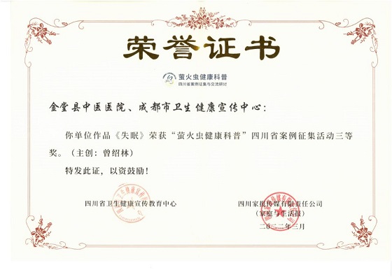 四川新闻网成都4月6日讯 4月1日,由四川省卫生健康宣传教育中心、四川日报报业集团家庭与生活报、中国生命关怀协会医院人文建设专委会共同开展的“萤火虫健康科普——四川省案例征集与交流研讨活动”在成都举行,金堂县中医医院报送的科普视频《失眠》荣获视频类三等奖。