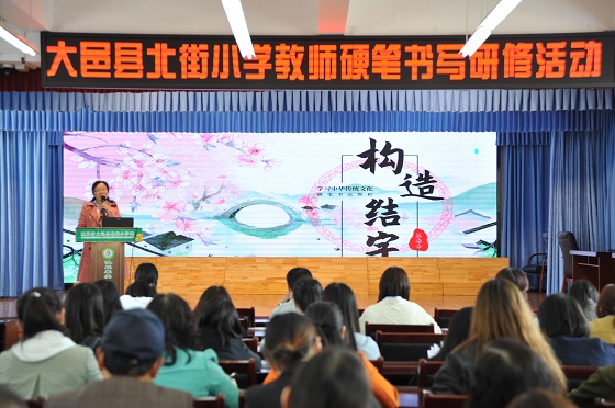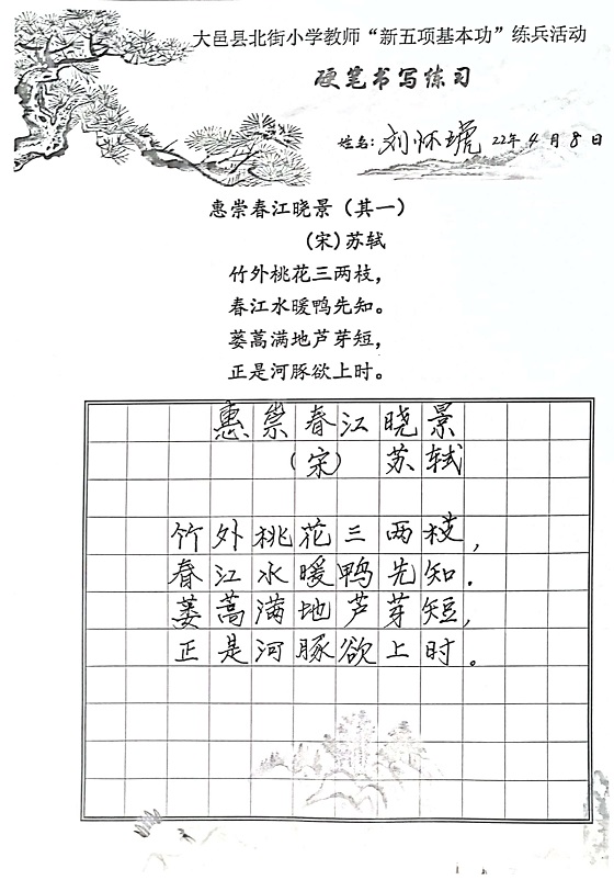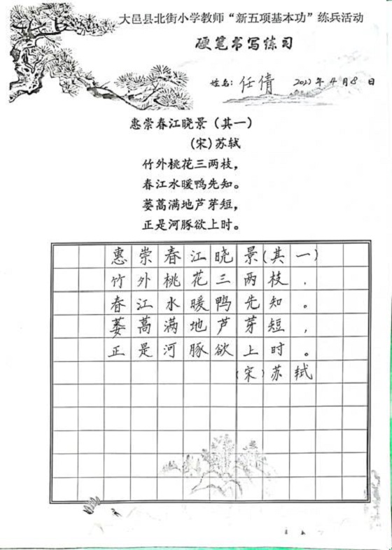 导读结束后,大邑县北街小学全体教师一起进行硬笔书写练习,书写苏东坡的《惠崇春江晓景》,老师们用心书写每一句经典诗词,认真品味书法艺术和东坡诗词的魅力。