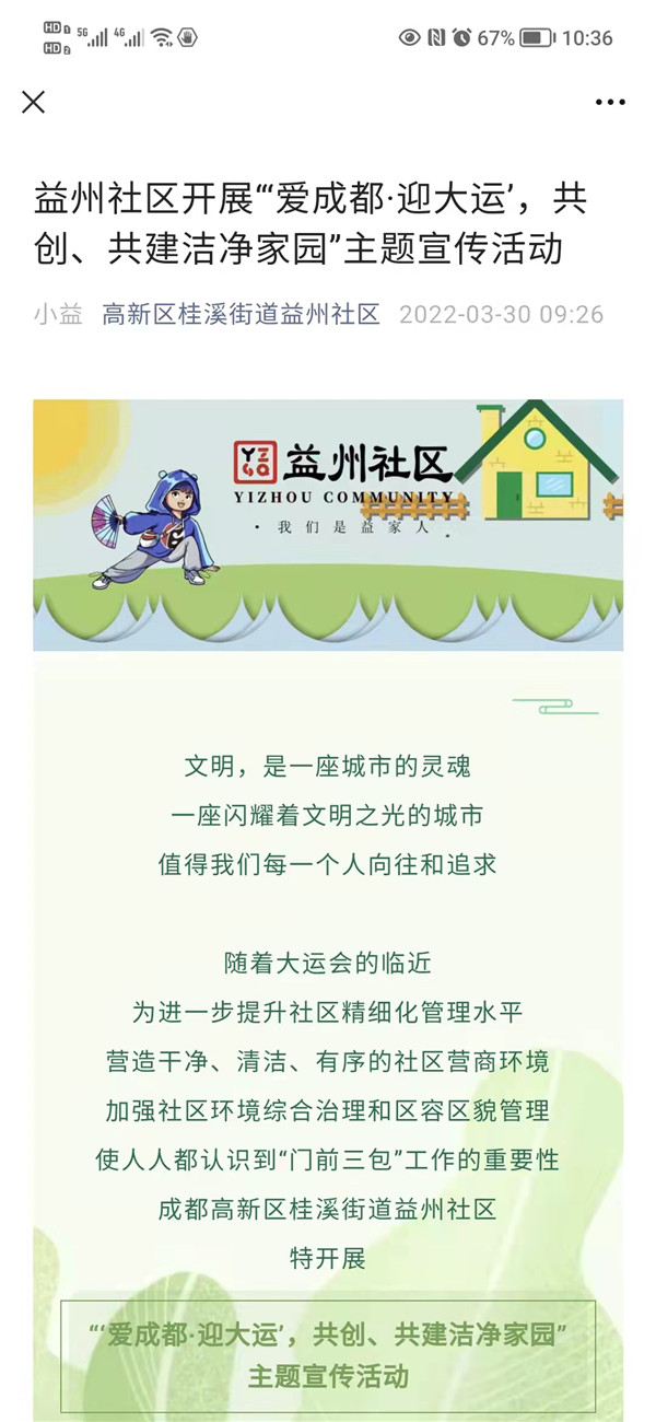 四川新闻网成都4月8日讯 大运会来临之际,为进一步提升益州社区精细化管理水平,营造干净、整洁、有序的社区营商环境,携手辖区商户共同助力建设文明社区,3月30日至4月8日,成都高新区桂溪街道益州社区通过线上方式,开展为期10天的“‘爱成都·迎大运’,共创共建洁净家园”主题宣传活动。