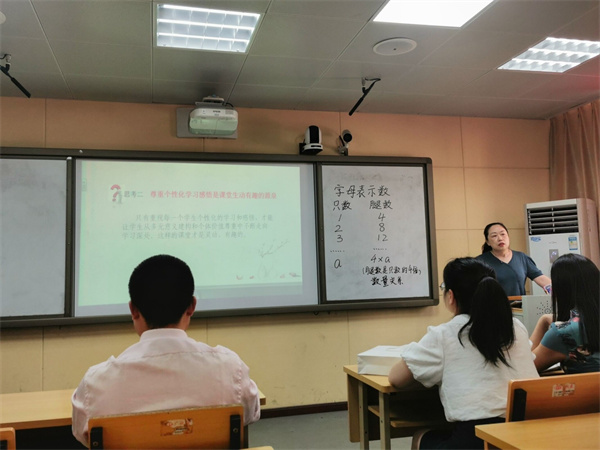 活动开始,首先由四年级数学教师刘怡执教了《字母表示数》,展示了四年级组集体教研、磨课的成果。课上,教师通过精心设计的环节,层层递进,引发了学生的思考,引导学生通过自主辩论突破了重难点。