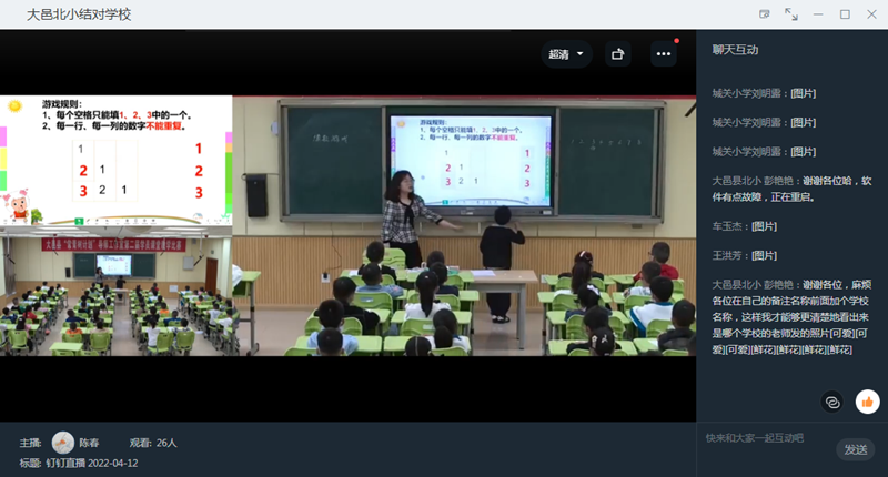 成都市第一教育联盟、大邑北小共同体、松潘县城关小学、大邑县北街小学名校集团的老师们通过网络在线观看本次赛课活动,并通过在线互动及时进行评课,肯定了各位老师的优点,也对不足之处提出了自己的看法和宝贵的建议。