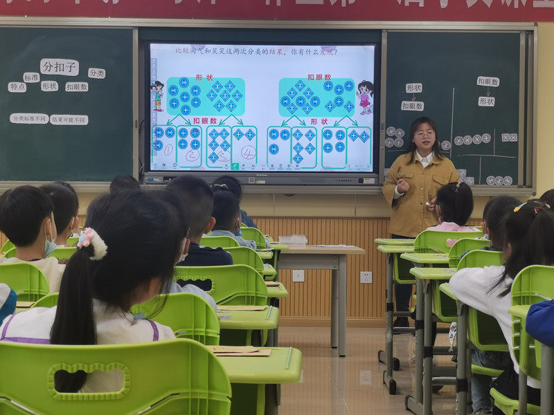 首先是陈弋老师执教一年级课例《分扣子》。陈老师用有趣的绘本故事导入《分扣子》,激发学生学习兴趣。学生在亲自动手分扣子过程中,切实体会到分类是需要标准的;在不同标准下,分得的结果有可能不同;如果一直分下去,分得的结果相同。这节课使学生获得了初步的数学活动经验,感受数学在日常生活中的应用。