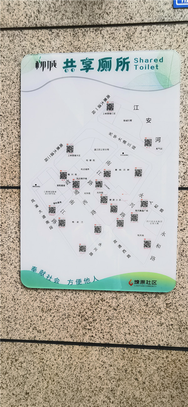 绘制“线上两张图”。在第一批录入的基础上,把新改建的环卫公厕、条件成熟的“厕所联盟”入盟公厕分批次录入百度地图;在“众治温江”APP、微信公众号公布现有环卫公厕、共享公厕点位图。绘制“线下一张卡”。在公园、广场、城市干道、公交站等人流密集处布设线下实体公厕指引图,方便市民无手机线下“以图找厕”;设计具有温江特色的社会共享公厕专属标识,提高辨识度,引导群众“看图识厕”。“线上+线下”。探索将公厕信息通过二维码集成到市政基础设施上,群众可通过扫码“识图辨厕”;将公厕二维码制作成“共享公厕数字地图”,目前柳城街办通过试点已有157户商家加入该地图,实现了厕所看得见、找得到。