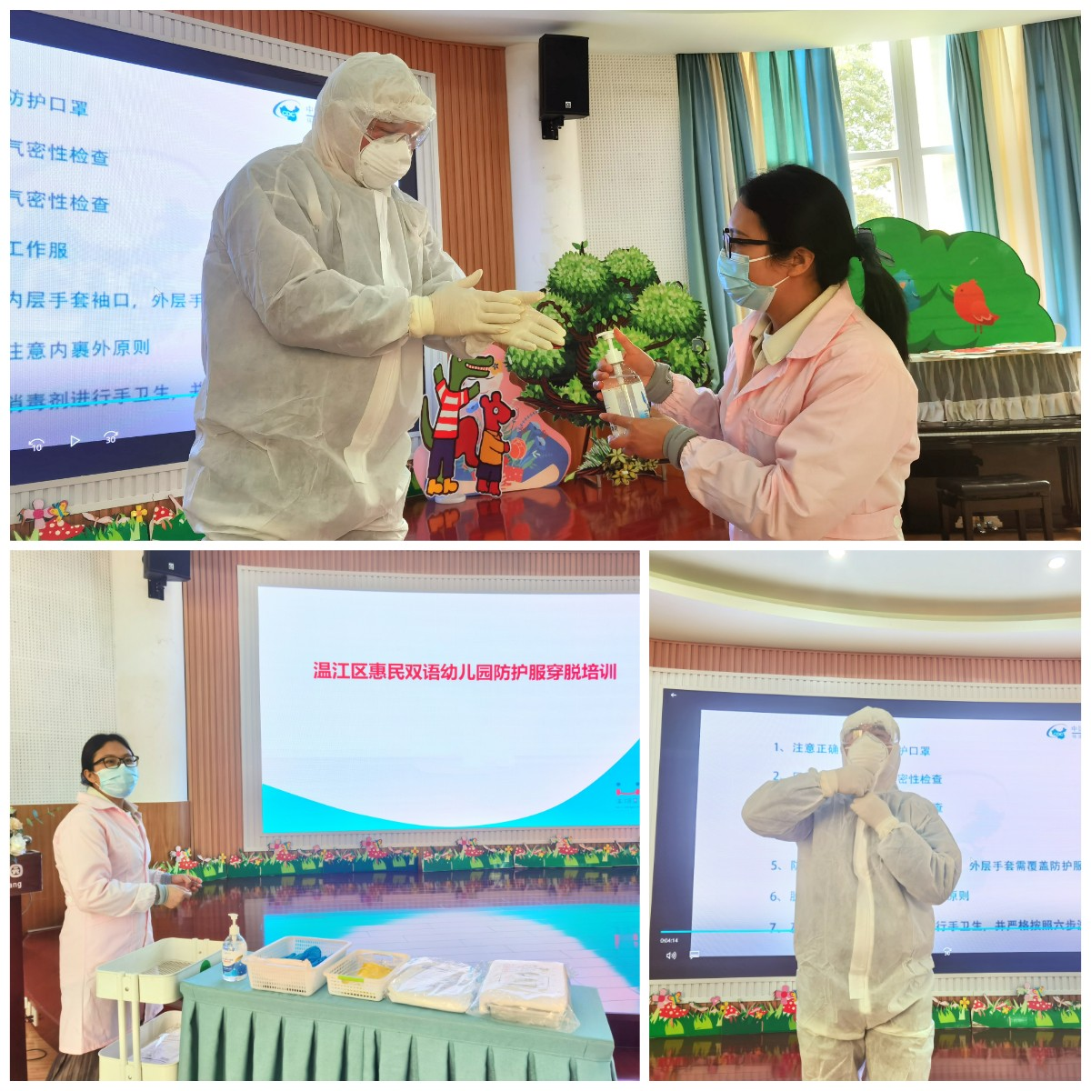 为更好地配合社区做好防疫协助,提高教职工的自护能力,4月11日中午,惠幼全体教职工开展了规范穿脱防护服的培训。全体教职工在保健医生李红梅的带领下观看了《防护服穿脱流程》的视频,通过培训对防护过程中的物品准备、穿脱步骤、注意事项及消毒处理方式等有了全面的了解。