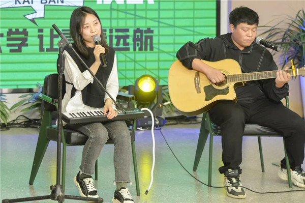 “和我在成都的街头走一走,直到所有的灯都熄灭了,也不停留……”在开班仪式上,空港新居民大学生代表一曲吉他弹唱《成都》,将大家带入浪漫的城市街头。音符跳动,琴声飞扬间,展现着“空港新居民大学”中产业工人们丰富多彩的文娱学习生活。