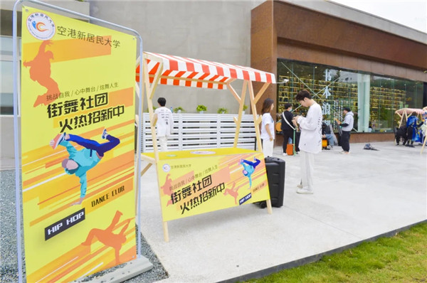 “空港新居民大学”音乐社、街舞社、动漫社、美妆社等社团也在开班仪式现场开展招新活动
