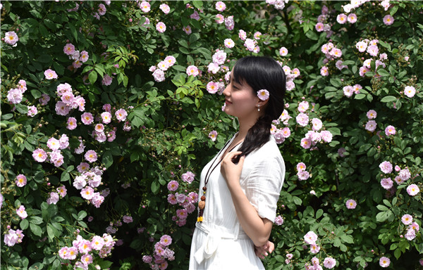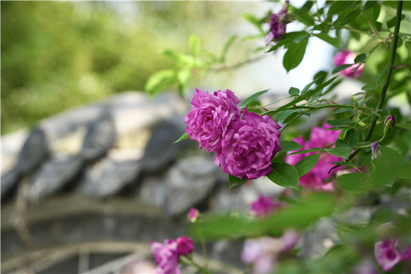 水晶帘动微风起,满架蔷薇一院香。一丛丛的蔷薇盛开在仿若丝绒一般的叶墙上,远远望去犹如艳丽夺目的锦缎,分外美丽。这锦缎萦绕在宝山,给这片绿水青山点缀不一样的色彩。蔷薇花脱俗而超然,没有牡丹的富贵,没有玫瑰的娇艳。但她会迎着阳光,向游人展示自己那一抹微笑。