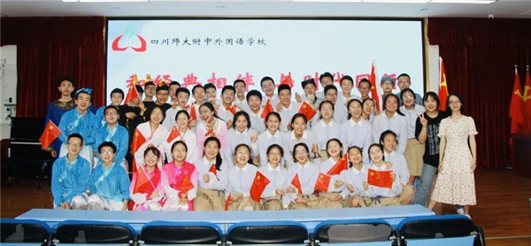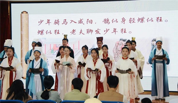 中华民族自古以来就有在暮春时节以诗会友、以歌怡情的优秀传统。春秋曾皙与老师孔子促膝畅谈“春风既成,舞雩咏归”的诗意人生;魏晋书圣王羲之执笔挥毫记录兰亭群贤流觞曲水的畅快幽情;唐朝诗圣一句“朝回日日典春衣,每日江头尽醉归”尽显文人豪情。时至今日,四川师大附中外国语学校学子效仿古人遗风,以经典为伴,与时代共舞,用精心准备的节目梦回古朝,献礼中国。
