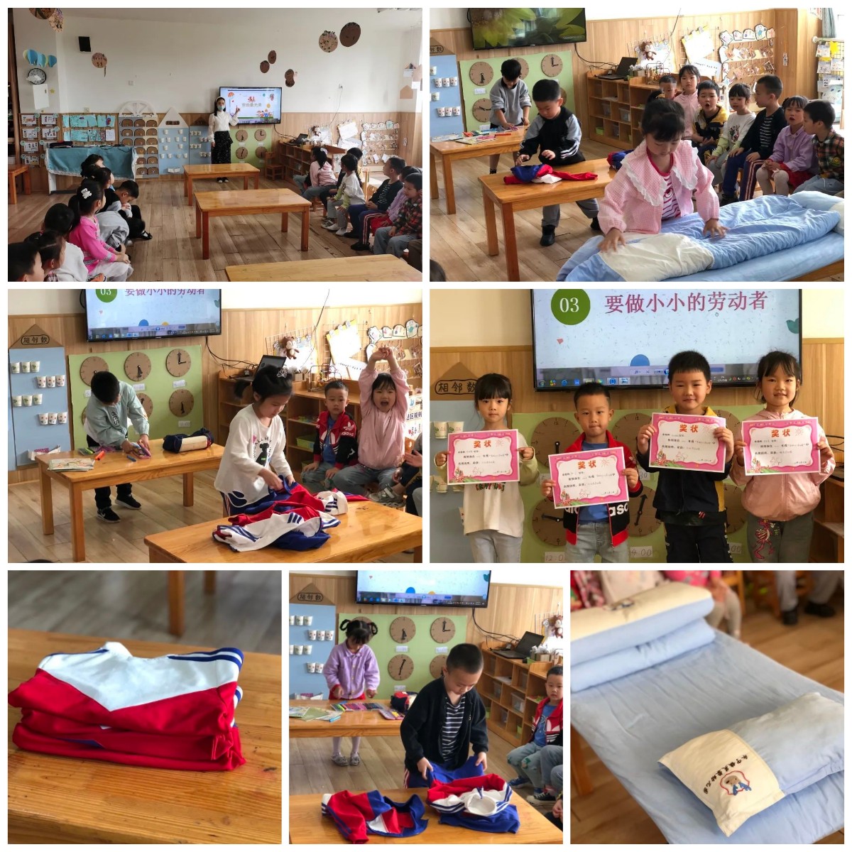 其中,大二班小朋友在五一节来临前还开展了“我是劳动小能手的大比拼活动”,旨在促进幼儿独立性的建立、自信心的增强,同时为幼儿进入小学奠定良好的基础。随着主持人的一声“比赛开始”,孩子们快速整理书包、叠整齐衣服和被子。看看,小朋友们叠的被子和衣服很不错吧!