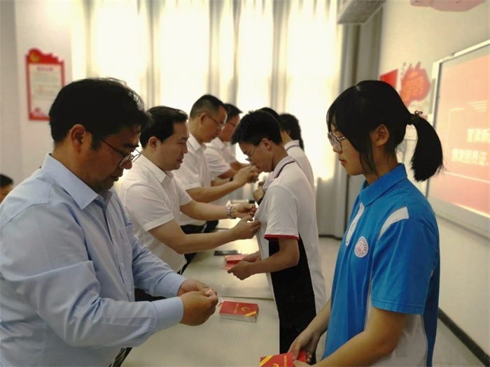 校团委书记张胜婷宣读新入团团员名单,校领导为新团员佩戴团徽、颁发团员证和团章。