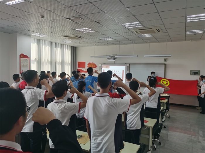 四川新闻网成都5月7日讯 为庆祝中国共产主义青年团成立100周年,进一步加强共青团员组织意识教育,激励共青团员厚植爱党、爱国情怀,增强共青团员的荣誉感和使命感,提升团组织的凝聚力和战斗力,成都市川化中学于5月4日下午在团队活动室为46名品学兼优的学子举行了2022年新团员入团仪式。川化中学党总支书记、校长陈露,副校长姜祥路、黄观友、张隆清副,德育处主任周虎,教务处主任袁义聪及安办主任赵焱坤出席仪式。仪式由校团委书记张胜婷主持。
