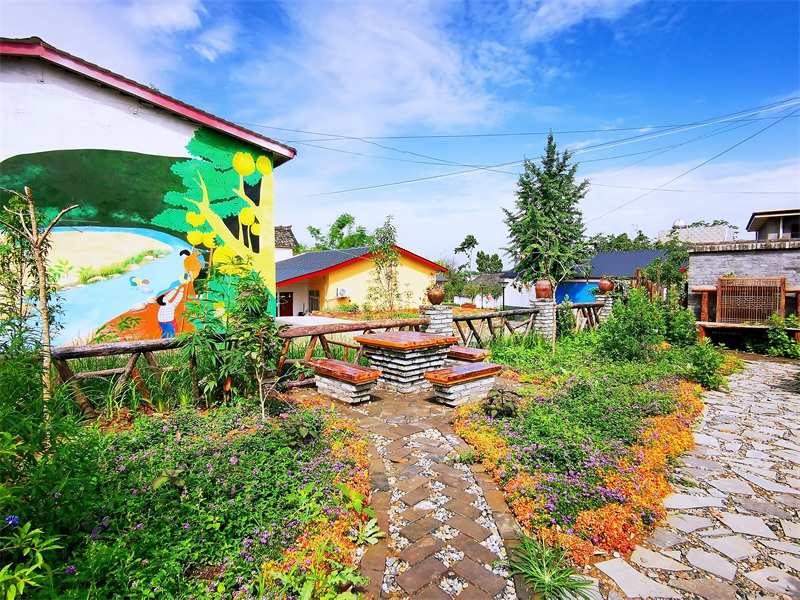 同时,依托玉皇山景区、旅游环线、一三产业,发挥交通区位和产业资源优势,引进田间小厨房、果园徒步、餐饮等不同业态,盘活院落经济;实施“山水红旗,乡村画镜”文创提升工程,对文化长廊、墙面彩绘、院落文化墙等进行打造,植入盘海店村本土元素、农耕、乡风民俗等文化元素。