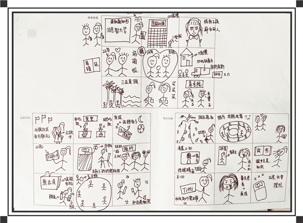 叙事绘画,叙事绘画是表达性艺术疗法中一种创新形式,将叙事和绘画两种行之有效的心理疗法相互融合,多维度表达心理活动,立体、形象又富有寓意。心理组与美术组展开合作,在非毕业年级开展了叙事绘画活动。初一初二年级叙事绘画的主题是《我的朋友圈》,和谐的人际关系尤其是同伴关系对中学生的重要性是不言而喻的,很多问题因为同伴关系而产生,也因为有了同伴的支持而解决,通过绘画和深入叙述朋友圈里的故事,感受来自同伴、家人、老师等给予的关注和关心。高一高二叙事绘画的主题是《三个“我”》,自我成长是高中生生命发展的重要课题,在九宫格中画出“过去的我”和“现在的我”,讲述画面背后的故事,产生新的理解和感悟,并把相关信息整合到“未来的我”中,获得新能量和新希望,促进个人成长。
