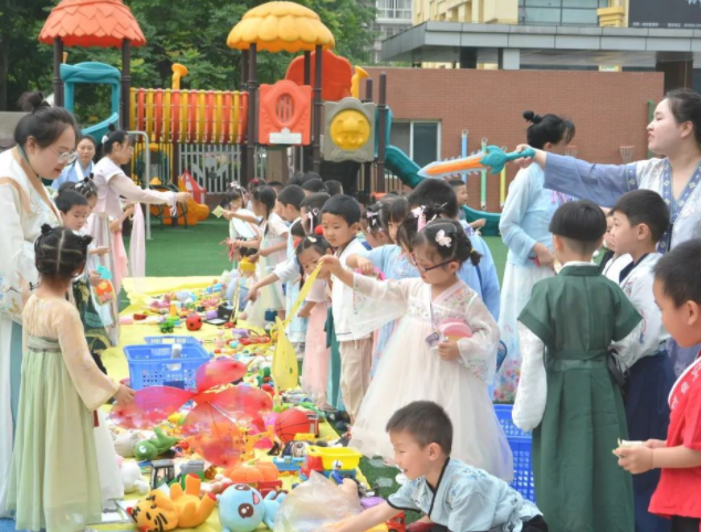 在属于孩子们狂欢的日子,不仅有好吃的水果捞、爆米花,好喝的绿豆汤,还可以逛逛义卖“集市”,小朋友们可以作为摊主出售自己的物品,也可以作为顾客挑选一下自己心仪的礼物,小朋友们亲自参与,即可以丰富幼儿的角色体验,沉浸式的感知传统文化的魅力。(陈凡坪)