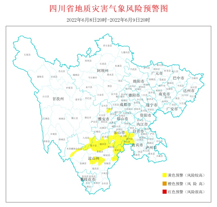 四川新闻网成都6月6日讯 根据四川省地质环境条件,结合四川省气象台天气预报情况,6月7日白天,全省大部多云间阴有分散性阵雨,发生地质灾害的总体风险较低;6月7日晚上到8日白天,全省大部阴天有小到中雨,局地大雨,芦山县“6·1”地震震区、甘孜州南部局地、凉山州中西部局地发生地质灾害有一定风险;6月8日晚上到9日白天,盆地西南部、南部和攀西地区有一次较大范围的强降雨天气过程,芦山县“6·1”地震震区、乐山中南部、宜宾西部、甘孜州南部局地、凉山州中北部发生地质灾害的风险较高(见下图)。