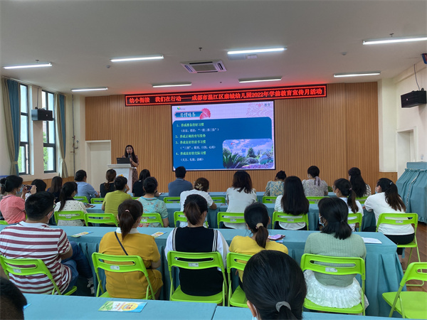 为缓解家长对孩子即将进入小学的焦虑,同时让家长了解小学的学习要求,温江区永宁小学校学生发展中心主任季丹以《春风化雨润无痕 立德树人催繁花》为题,针对目前小学一年级学生存在的实际问题,深入浅出剖析了幼儿园和小学教育差异,并从加强幼儿环境适应能力、人际交往能力、学习习惯和阅读习惯养成等方面向家长和幼儿园提出了指导意见和建议。