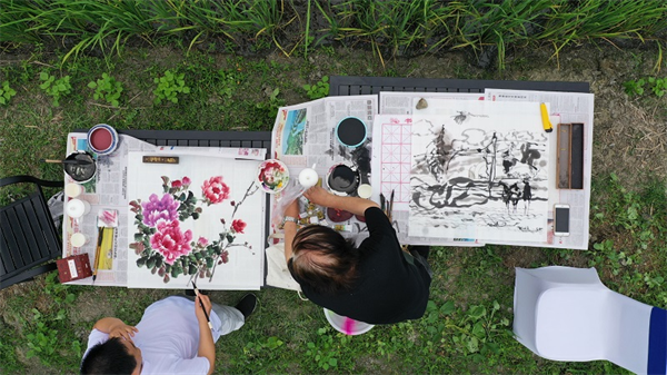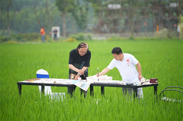 “乡村不仅要塑形,更要铸魂。”实地参观后,文艺大师和志愿者们都有太多感触。中国陶瓷设计艺术大师、中国西部陶艺文化中心主任周晓冰以及区美术家协会、区书法家协会、省硬笔书法家协会温江分会的老师们按捺不住心中的喜悦与激情,纷纷走进稻田,现场创作,泼墨挥毫,续纸不断,将美丽乡愁融入画卷。