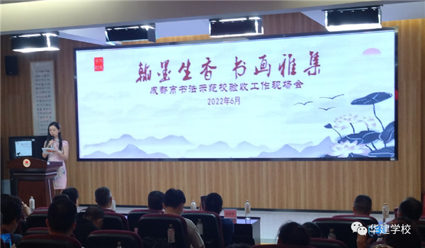 在验收工作现场会上,校长伍兴潮从领导重视、师资配备、课程开设、教学研究、活动开展、教育成果等多方面向来参加验收工作的专家和教育系统领导介绍了学校的创建工作,并对学校书法教育的未来做了展望:此次书法示范学校的获批坚定了华建走书法特色发展之路的决心,我们将把书法艺术教育“做大做强”,利用好馆校合作契机,坚持“走出去,请进来”,举办区域内有影响的大型书法展览,更多的涌现出区域内有影响力的优秀书法教师,培养出获国家级、省级书法比赛荣誉的优秀学生。
