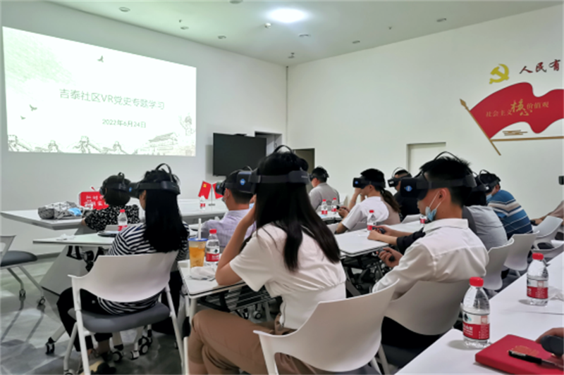 本次VR主题党日学习通过虚拟仿真技术,实现理论实践一体化教学,突破传统课程和学习局限性,以“追寻红色足迹,感恩幸福生活”——中共一大、“追寻红色足迹,我心永向党”——飞夺泸定桥两个主题,带领大家穿越时空参与到中共一大会议召开的全过程,身临其境重温革命先烈艰苦卓绝的奋斗历程。现场一位党员说道:“一船红中国,万众跟党走”,此次互动体验式学习,让人仿佛回到了历史场景之中,就像亲身经历过一样,见证中国共产党人的初心使命。吉泰社区党委书记王锐表示:我们要在百年党史学习中,始终做政治上的明白人、初心使命的践行者、革命精神的继承人、勤政务实的实干家。