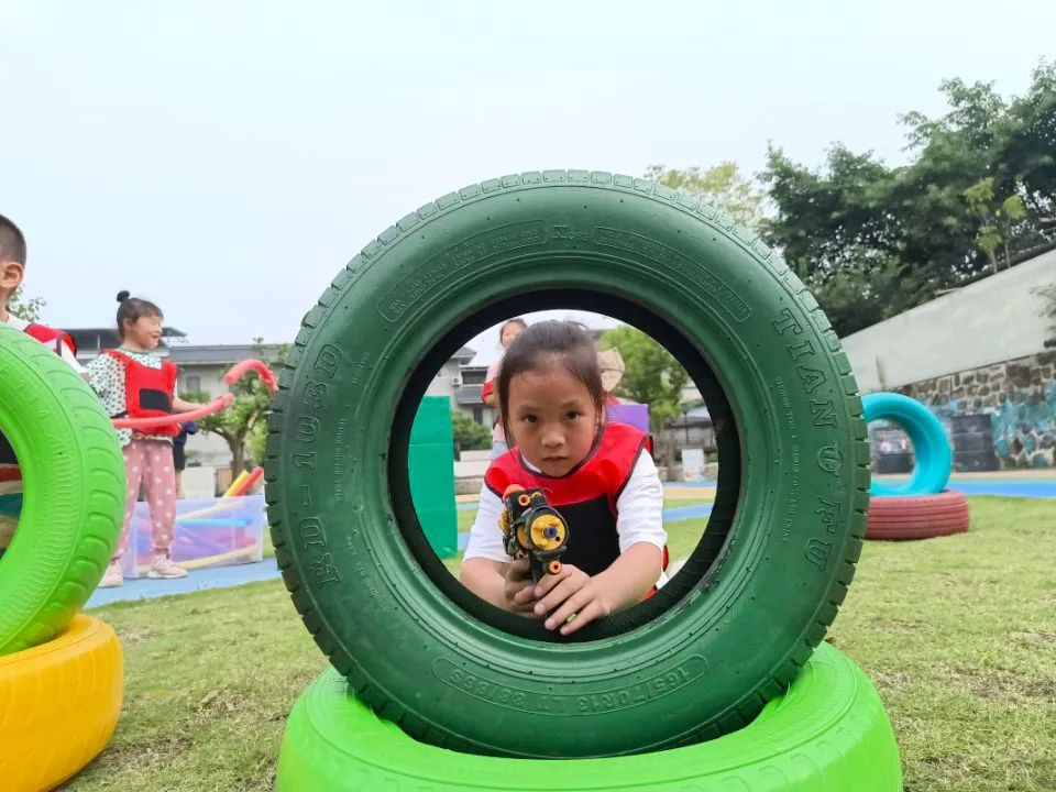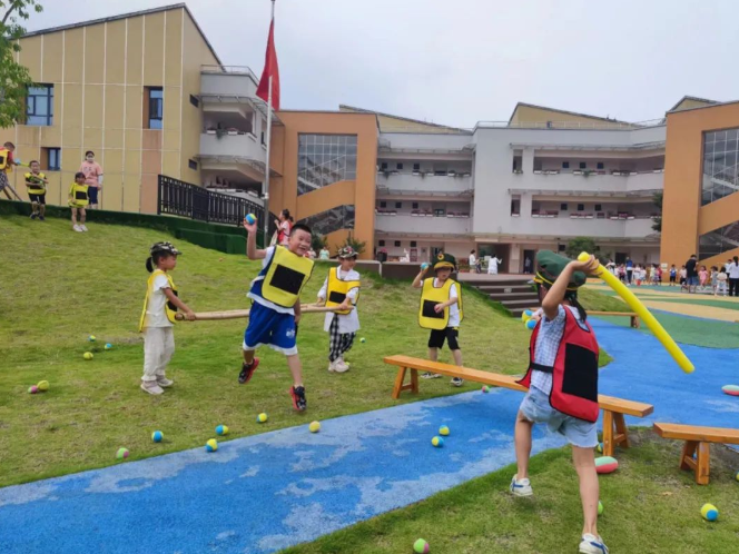 游戏中,孩子们穿上装备,自发分成红队和黄队并分配角色、小组长指挥商讨战略布署。一声号响,“战争”开始了,绿草坪变成了孩子们作战的场地,整个区域上演着激烈的角逐。