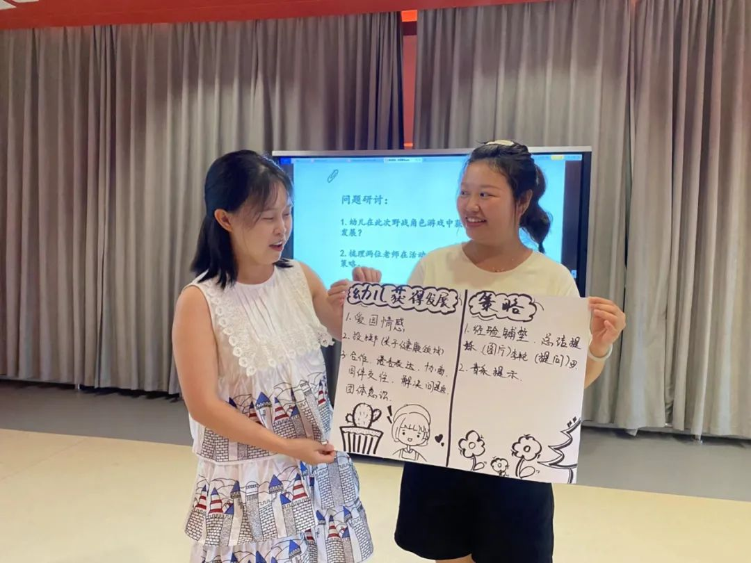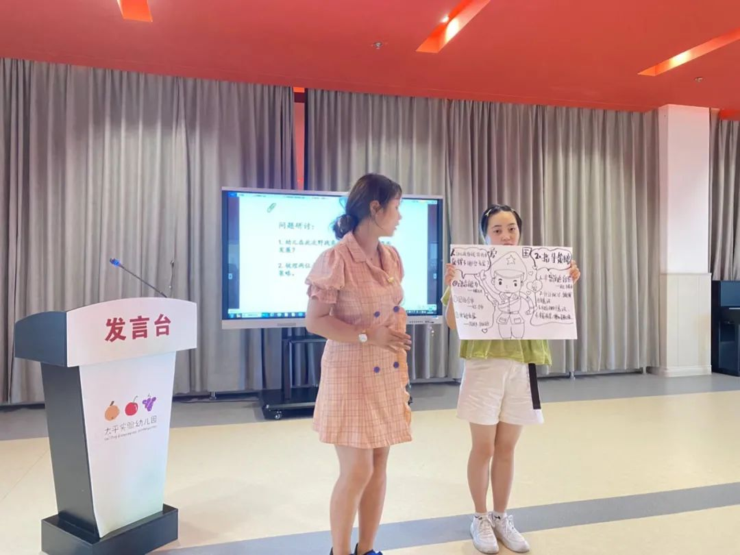活动结束后,教师们围绕着“幼儿在现场野战角色游戏中获得了哪些发展、两位老师在活动中运用了哪些指导策略”展开讨论,不断碰撞产生新的思维火花。
