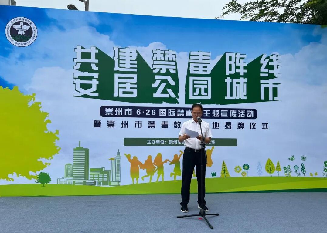 崇州市委常委、政法委书记、市禁毒委主任贺业贵在揭牌仪式上致辞,指出崇州市禁毒教育基地的建设和投入使用,顺应了当前全市禁毒工作的新形势,满足了人民群众对禁毒教育工作的新要求,是全市禁毒工作中的一件大事,也是崇州创建省级禁毒工作示范县(市)的一项重要举措。