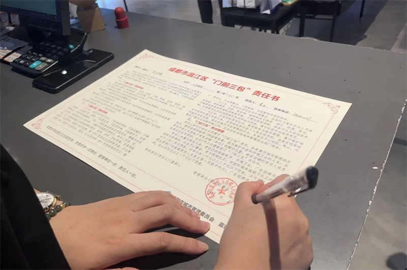 温江区综合行政执法局开展上门服务,与商户签订“门前三包”责任书,并向商户发放了“门前三包”宣传手册,耐心地为商户讲解“门前三包”具体责任内容,叮嘱他们做好自家责任田的环境秩序维护工作。